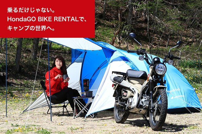 全店にホンダ二輪整備士の資格制度であるHMSE資格を有する整備士が在籍。新型車両や充実のプランを用意。テント、寝袋、テーブル、ランタンなどのキャンプギアをセットでレンタルできる「キャンプツーリングセット」を展開中。参考料金:デイキャンプ(当日返却)の場合15,400円(税込)、1泊2日の場合:18,700円(税込)。