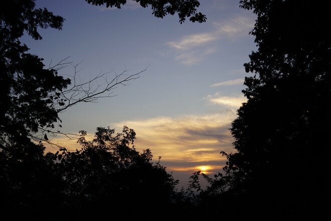 日の出直前の登山口は街灯で照らされています。幸い、ヘッドランプを点けなくても十分歩ける程度には明るいので、いざ登山スタート。