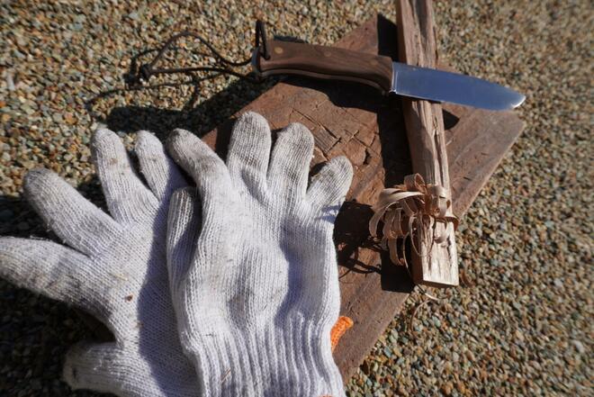 調理、薪割、着火などいろいろな場面で活躍する「フルタングシースナイフ」。今回使用したのは「JOKER ノマドナイフ」。