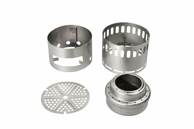 アルコールストーブと上部スタンド、下部スタンド、パワースタンドが入ったセットで、素材は軽量、耐久性、耐食性を備えたチタンを採用。信頼の日本製なので、安心して使うことができる。