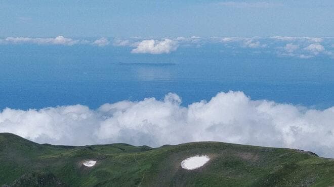 山形県酒田市の沖に浮かぶ「飛島(とびしま)」が見える。 帰りは来たルートをそのまま戻る。日本海を見下ろしながらの下山となる。