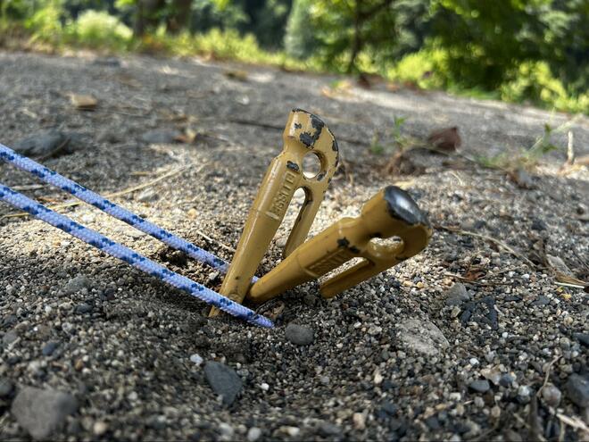 地面に対して60°くらいの角度で、テント・タープと反対側に傾けて打つことで耐久力が増し、テントやタープをしっかりと固定できる。写真は撮影のため、角度がわかりやすいように深く打ち込んでいないが、実際は引っ掛ける部分が埋まり切らないくらいまでしっかり打ち込む。