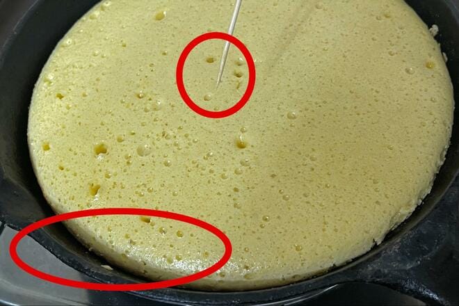 側面が焼けてきたのを確認したら、爪楊枝などでカステラのど真ん中を差し、焼けているか確認する。爪楊枝に生地がついていなかったらOK。フライ返しで、生地の下に綺麗な焼け目がついているのを確認したら、生地をひっくり返す。3分ほど焼いたら完成だ。