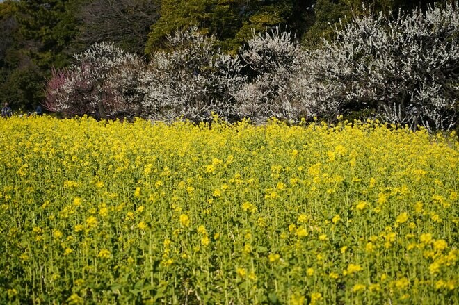 この時期の見どころは何と言っても一面に広がる黄色の菜の花畑と紅、白と見頃を迎えた梅。一気に春の訪れを感じさせる鮮やかで温かみのある花々に囲まれていると、時がたつのを忘れてしまうほど。ようやく冬が終わり、身も心も軽やかに感じられてくる。