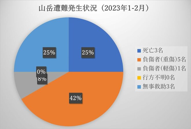 2023年1-2月(山梨県警発表)の山岳遭難発生状況を振り返り、山梨県在住の登山ガイドである渡辺佐智が県警地域課へのインタビューを行い、遭難事故データをもとに冬季(2ヵ月分)の傾向を解説していく。