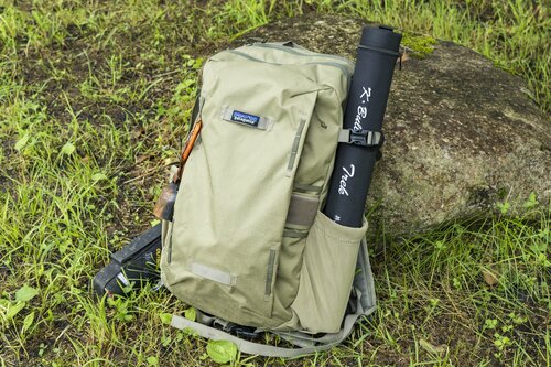 渓流フライフィッシングの道具で一番嵩張る(長い)のはロッドでしょう。山奥に釣りに行くときはパックロッド(継数が多く、仕舞寸法が短い竿)を使用していますが、自転車釣行でも重宝しています。バックパックのサイドに取り付けたとき、飛び出す分が少ないので安心です。あまり長くでていると木の枝下をくぐるときなど、うっかり引っ掛けてしまうリスクがありますね。徒歩よりずっとスピードの速い自転車での移動では、長く飛び出したロッドだとかなり危険です。ちなみに、徒歩での移動ではロッドソックス(竿袋)のみでも大丈夫かもしれませんが、自転車での移動時は万が一の転倒に備えてハードケースに入れて携行しています。