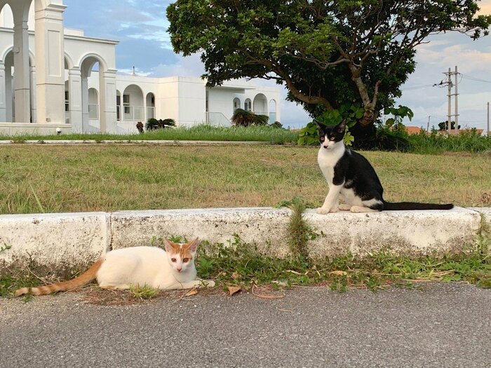 日没間近の、島がいちばん美しい時間に猫たちはエントランスに現れた。草刈りをしているスタッフさんの後ろで小さな2匹が駆け回り、その様子を少し大きな1匹が見守っている。聞けば、大きな雄と小さな2匹は叔父と甥の関係だという。普段であれば、夏場はホテルも満室でスタッフさんも忙しい時間のはずだが……、いつもとは少し違う夏。猫たちと遊びながら、このホテルで暮らす歴代猫たちのお話も聞かせていただいた。島猫たちにとっても、久しぶりに「離島らしい時間」が流れる夏だったのかも知れない。