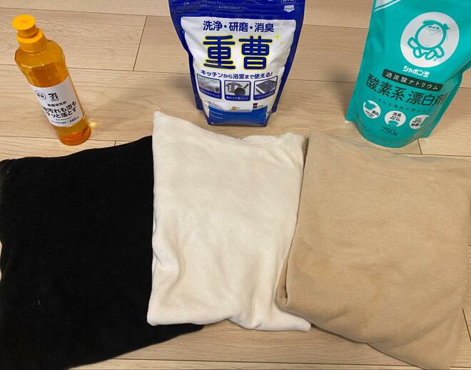 2つめは粉末の重曹を用いる方法。重曹は油汚れを落としたり、柔軟剤の代わりにもなる。普段から洗濯に重曹を用いている人もいるようだが、絹やウール、綿や麻など使用できない素材が多いので注意が必要。今回は重曹水に漬け込み、通常通り洗濯を行った。