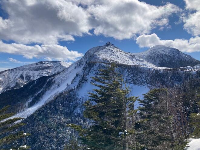 渋の湯から本格的な登山道となり、序盤は勾配も急で一気に標高を上げていく。樹林帯歩きがほとんどのため、滑落の危険などは少ないがアイゼンを装着し、一歩一歩慎重に進んでほしい。これから雪山にチャレンジしたいと思っている人にとってはちょうどいい練習の場と言えるだろう。