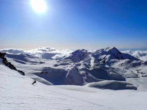 まず初日は富山県の立山、室堂までの移動。富山県側からは立山町からバスで、長野県側からは電気バスやロープウェイを乗り継いで、標高2,450mの立山室堂まで移動することができる。乗り物移動だけでも半日近くかかるので初日は室堂山荘に宿泊。午前中に移動して宿に入った後、足慣らしを兼ねて軽装備で立山の主峰である雄山(3,003m)へ登ってひと滑り。2日目は日の出前の朝4時に出発。長い行程となるので余裕をもって目的地に着くために早出を心がける。この日の移動は4回ほど登りや滑りを繰り返し、16時にスゴ乗越到着。12時間の長丁場だった。