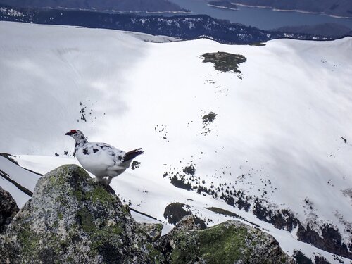 3日目は朝6時30分出発。朝の準備には時間がかかるのと昨日の長時間行動の疲れもあったので、この日の行程は短めに設定した。スゴ乗越から薬師岳までの稜線は人気の少ない静かな山域だが、そのせいもあってか雷鳥の姿が目立った。この日は百名山でもある薬師岳(2,926m)まで登り、太郎平までのロングスキー滑走で早めの終了。天気がやや不安定な日だったので短い行動が丁度良かった。