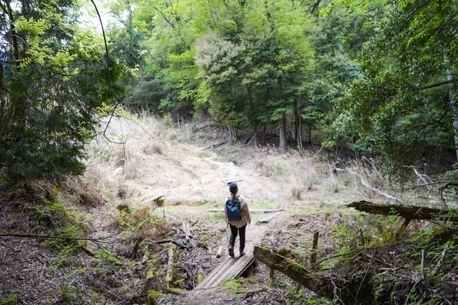 帰りは、早尾神社の境内へと続く道を下山。近くを流れる涼やかな清流に癒されながら帰路に着く。こちらの道は広々としているので、迷うことはなく安心して帰れるだろう。