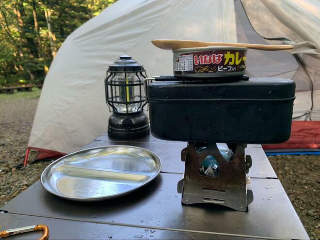 2日目の朝は、メスティンでご飯を炊き、持参した缶詰のカレーを食べた。本来は強力粉を持ってきてナンを焼いてカレーと食べる予定であったが、強力粉を家に忘れてきたので急遽ご飯で食べることに。こういった不測の事態に備えて、お米は少し多めに持参しておくと安心だ。
