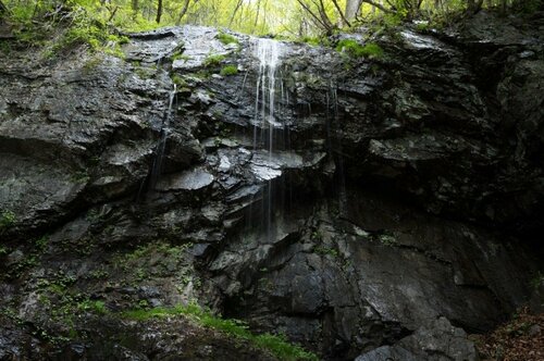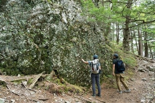 稜線に出るまでは、巨大な木々が立ち並ぶ森の中をひたすら登っていくのですが、道中唯一わかりやすいポイント、不動の滝はちょうどいい休憩スポットになるでしょう。冬は見事な氷瀑にもなるそうです。