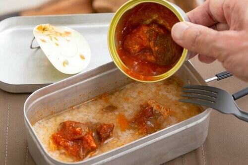 そして、缶詰博士的には加熱時間が短くて済むのが嬉しい。というのも缶詰を使った炊き込みご飯を作る際に、アルファ化米、水とともに缶詰の中身をクッカーに入れて炊いても、過剰な熱が加わらないから具がパサつかないのだ。イイネ!