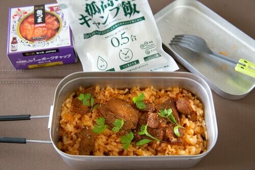 かくのごとし。孤高のキャンプ飯1袋分(0.5合)に対して、国分北海道の「缶つまJAPAN 北海道産ふらのポークチャップ」を1缶使って、炊き込みご飯を作ってみた。