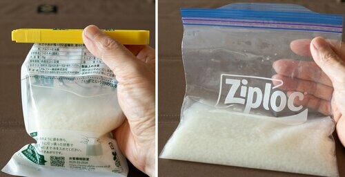 ただ、パッケージにジッパーが付いていないため、水を注いだ後の密封が難しかった。写真のような保存用クリップを使っても、横に倒すと水が漏れてしまうのだ。ジップロックなどの容器に移した方が手っ取り早いと思う。