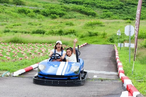 やまびこペアリフトに乗って、お目当ての「サマーボブスレー706」のスタートへ。全長706mのロングランが楽しめます。自分の加減でスピードを出したり、ブレーキをかけたり調整可能です。カーブが急な部分もあるので、減速しないとコースアウトしてしまうので攻めすぎには注意を。スピードを出してコースを滑り降りる感覚は、スキーやスノーボードに似てスリル満点で楽しかったです。スピードが苦手なら、エンジンのついた「マウンテンゴーカート」で緑と花のコースを駆け抜けるのもよいでしょう。