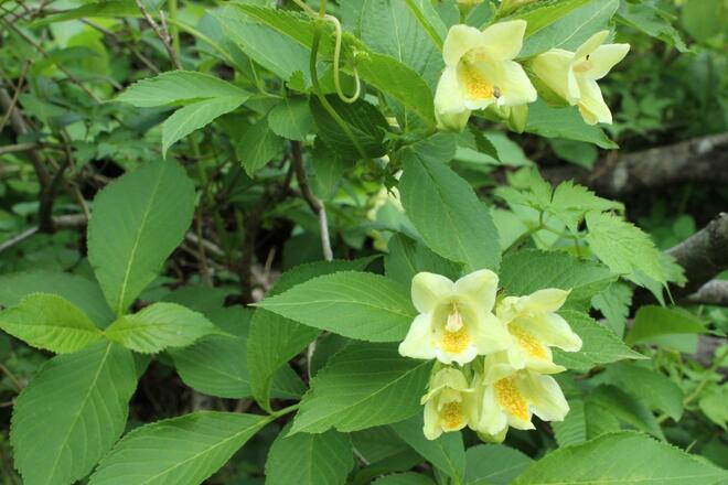 濃いピンク色の花を咲かせるエゾツツジやクリーム色の花のウコンウツギは、北海道と東北でしか見られない。