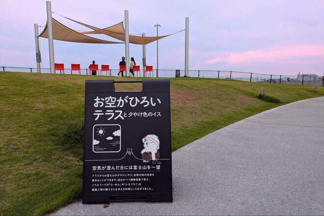 「お空がひろいテラス」の先には佐野の街が一望でき、天気のよい日には富士山が望める。おすすめは、マジックアワーといわれる時間帯。1日の中でわずかな時間帯だが、空の色の美しさは秀逸で、それを見るためだけに立ち寄る価値がある。ドッグランが新設されたほか、「さのいろソファ」「夕焼け色のいす」「麺ソファ」といった個性的なソファでくつろぎの時間を楽しめる。