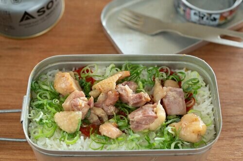 かくのごとし。蒸らし終わったごはんに九条ネギと鶏肉をのせ、缶内にへばりついていた油も残さず上から垂らしたら缶成(完成)!