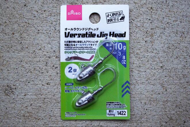 ダイソーの「オールラウンドジグヘッド(10g)」は、水深10m以内の浅瀬に寄るアイナメ釣りで有効だ(水深に対しての重さの基準は、水深1mで1g)。重すぎないので、障害物があるエリアではロッドを軽くあおる動作を行えば根がかりしにくい。また、スイミングの姿勢もよく、フックの強度も十分で大型のアイナメの引きにも耐えられた。