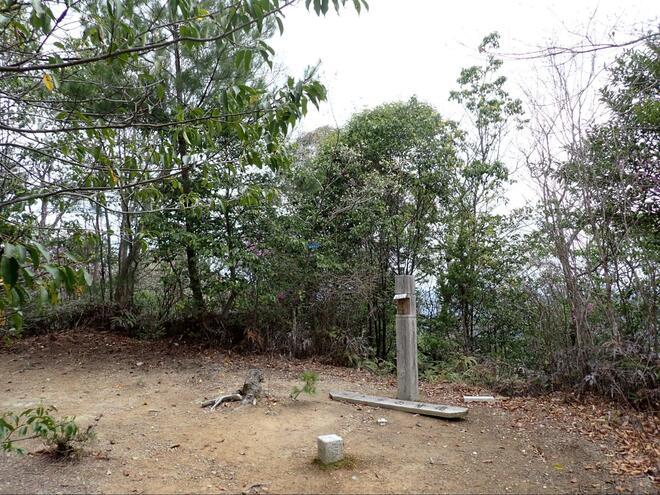 ホオノキの道の中間地点には展望台がある。ただ残念ながら周囲の木々が成長してしまい、眺望はほとんどない。通宝寺山も眺望がないが、通宝寺山から尾根伝いにすぐの公園内最高標高地点(357m)の眺望は開けている。真下に弥勒寺も見えるが、布袋尊は木に隠れて見えず、少し残念だった。
