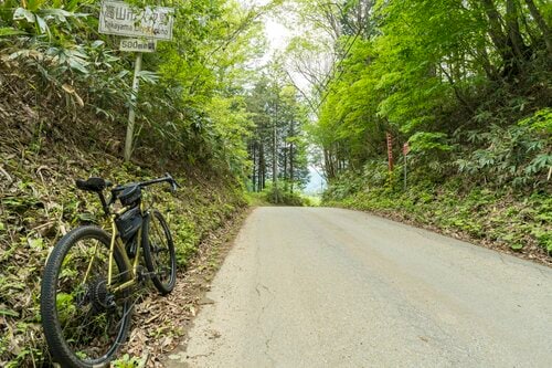 グラベルロードに別れを告げ、鋭角に曲がって車道を走り、美女峠に向かいました。しかし地形図に載っている割にはとくにそれらしい標識もなく、若干肩すかしをくらった気分です。ときおり香る藤の花の芳香にだけ色っぽさを感じました……。