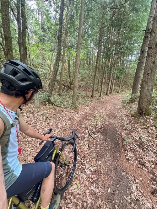 ここからは道もしっかりとしており、気持ちのいいグラベルライドを楽しめます(車止めがあったくらいなので自動車も走れる?)。前半が難路だっただけに快適さを一層感じます。しかも傾斜も緩いところが多く、後半に向けては下りが続くグラベルロードにご機嫌です。場合によってはこちら側だけ、つまり今回のゴールに設定している「美女ヶ池」からの往復ルートの方が一般的なのかもしれません。
