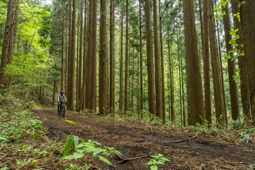 心地よい振動を感じながら下っていくと森はひんやりとした杉林となり続いていきます。ただ、轍には水たまりがしっかりと残っており、とても避けきれません。すっかり泥にまみれ水浸しになって“水も滴る”状態でしたが、美女どころか誰一人すれ違うことなくグラベルロードは終わりました。