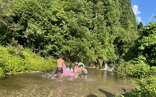 キャンプ場の敷地内には、子ども向けの遊具やプールが用意されており、砂防ダムでの水遊びも楽しい。また、日暮れになると日本海に沈む夕日を見ることができ、夜は頭上いっぱいに広がる星空を鑑賞できるなど、自然の営みを実感できる。