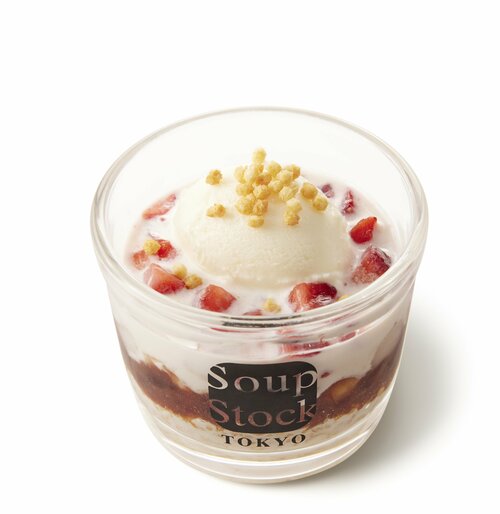 スープのほかにスイーツメニューもあり、ベトナムのぜんざい「チェ」をアレンジした「苺とあずきミルクのチェ(長野県産いちご使用)」は、甘酸っぱい苺に小豆の優しい甘さがマッチ。トッピングのぶぶあられが香ばしい。