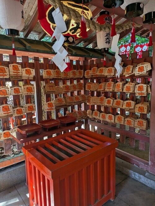 楠宮稲荷社の御神木と、奉納されている赤えい絵馬(500円)