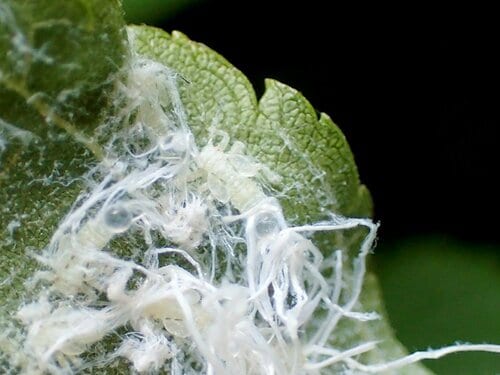 まず、クワキジラミの幼虫。「カメムシ目キジラミ科」に属し、名前の通り「クワ」の木につく。少し離れた場所から見ると、樹木の葉にひも状の綿が付着しているように見える。しかし近付いてよく見てみると、腹部の先端に細長いロウ物質がついているのだ。