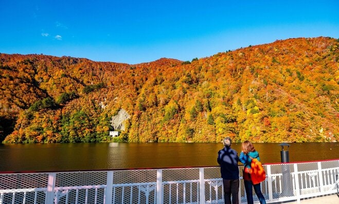 新潟県と福島県の県境にある奥只見湖は、深い山の中、何本かの枝を伸ばすように複雑な形で広がっている。1960年に水力発電所のダム建設のために作られたもので、貯水量6億㎥と、人造湖としては国内最大級の規模を誇る。山間の雄大な自然の中を、遊覧船で巡ることができ、とりわけ、秋の紅葉風景の中でのクルーズは大人気だ。湖畔に聳える切り立った2,000m級の山々(平ヶ岳、荒沢岳、燧ヶ岳)が鮮やかに色づいた様子を、その真っただ中の湖上から眺めるのは格別の迫力がある。まさに森が醸し出す「天然」の力強さを感じることができる絶景体験であり、旅行業界誌「プロが選ぶ水上観光船」の第5位にもランキングされている。