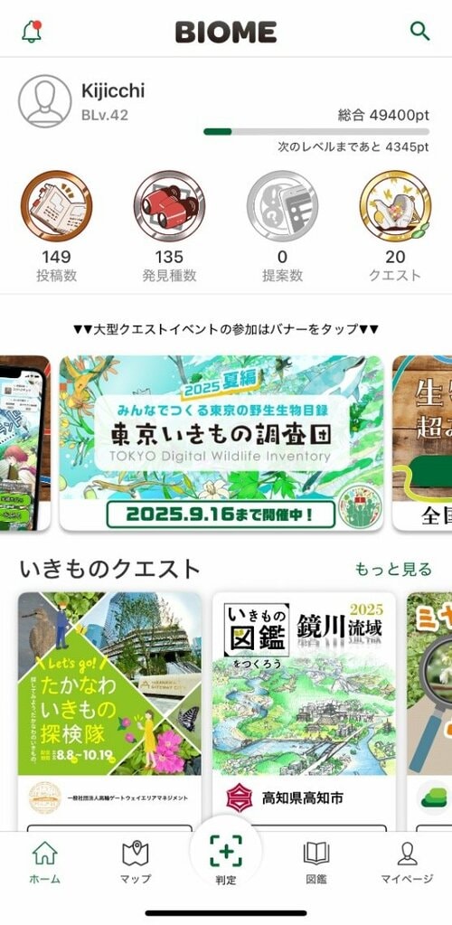 Biomeは、スマホで撮影した写真をもとに、独自の名前判定AIで国内に生息する約10万種の生きものの中から候補を提示してくれるアプリです。特徴的なのは、ただ「名前を知る」だけで終わらず、観察そのものを楽しむ仕掛けが多いことにあります。