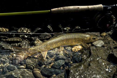 無事にランディングしたイワナは、光の加減で黄金色にも見えます。もっと大きい魚もいましたが、丸々とした魚体にすっかり満足しました。