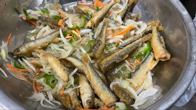 秋冬のオイカワは臭みが少なく、脂が乗って美味しい。持ち帰るときは氷で冷やし、水気を取って保存する。下処理はシンプルでよい。まずはボウルにまとめて入れ、粗塩を振ってぬめりを取る。水洗いするとウロコも簡単に取れる。次にハラワタを取り除き、骨が気になる大きめの個体は頭も落とす。揚げ方は二度揚げにすることで骨まで柔らかくなり、南蛮漬けや素揚げで楽しめる。よりサクサクとした食感が欲しい場合は、片栗粉をまぶしてから揚げるのがおすすめだ。