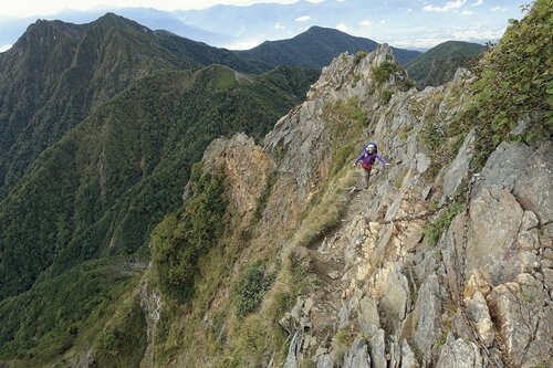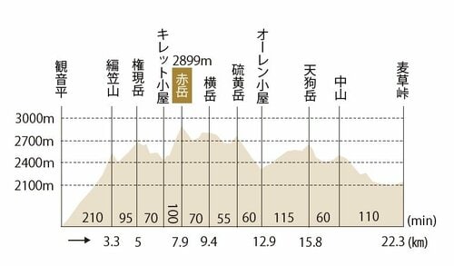 キレット小屋から赤岳(2,899m)のコースタイムは2時間、高低差は約450m。行程は短く感じるが、切れ落ちた岩場のトラバース、鎖場やハシゴをいくつもやり過ごすので緊張感を切らさぬようにルートを進んでいく。手を使ってよじ登る岩壁では、石を落とさぬように気を付けつつ、上からの落石にも注意。