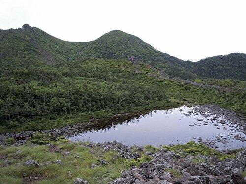 天狗ノ奥庭にある擂鉢池は黒百合ヒュッテから岩を登ったすぐ上。ここは双耳峰の天狗岳を一望できる展望地。雨や雪解け水が溜まったものなので、水が枯れていることもある。