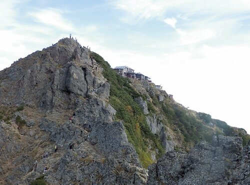 岩塊のピークに人だかりや山小屋が見えたらそれが赤岳の山頂。南峰直下から上がっていくのだが、近づくとピークが見えないのでルートに沿ってひたすら登るのみ。山頂は八ヶ岳連峰をはじめ、北アルプス、中央アルプスや御嶽山、南アルプスまで名だたる名峰をパノラマで見渡せる絶景だ。