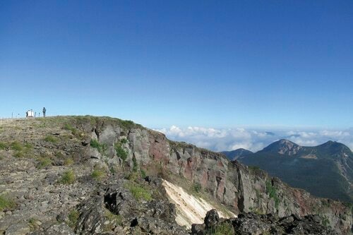 硫黄岳は平坦なピークのすぐ脇に爆裂火口跡のダイナミックな絶壁が広がっている。来た道を振り返ると、眼下に硫黄岳山荘、奥には岩峰が特徴的な横岳と主峰赤岳などが見える。なお、硫黄岳は天候が崩れて視界が悪くなるとルートがわかりにくい。ケルンを道しるべにルートの確認を。