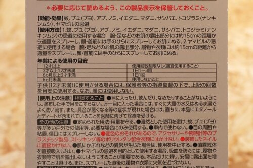 4種のうるおい成分(ヒアルロン酸Na、コラーゲン、セラミド、ビタミンC)を配合していて、皮膚アレルギーに対してもテスト済みということです。なお、効果・効能としては、「蚊、ブユ(ブヨ)、アブ、ノミ、イエダニ、マダニ、サシバエ、トコジラミ(ナンキンムシ)、ヤマビルの忌避」と明記されています。