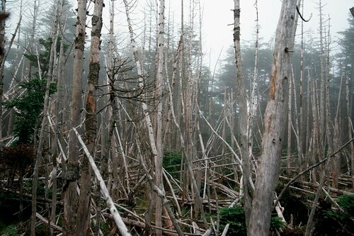 鞍部には縞枯現象の一部か、不自然に立ち枯れた針葉樹の木々がある。鞍部を過ぎるとおよそ20分ほどの軽い登りに。すると、すぐに山頂へ到着する。山頂は木々に囲まれていて、展望には恵まれない。縞枯山のピーク手前に展望台への分岐があるので、パノラマを見るなら展望台へ行こう。