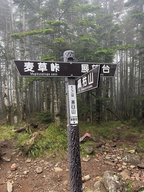 登り終えたら、ふとしたタイミングで分岐のような、茶臼山の山頂が現れる。なだらかな山なので、山頂が平坦なのである。山頂と気づかなそうなピークを標識に従って、縞枯山方面へ。鞍部までは下り坂となる。多少ザレたような足元なので、滑らないように気をつけながら下ろう。