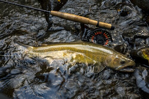 落ち込みの脇の白泡にフライが吸い込まれ、沈んだマドラーミノー(フライの一種)をリトリーブ(手繰る)した瞬間、鈍い重みがラインに伝わってきます。