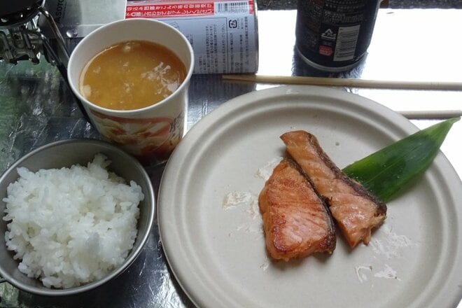朝食はソロクッカーとワンバーナーで、白飯、味噌汁、おかず一品(焼魚)を効率よく作り、しっかり食べる。キャンプであれば炭火や焚火をおこしたくなるが、全身に煙臭さが残り、火の始末にも時間がかかる。時間短縮と省力化のため、ガス火を使う。