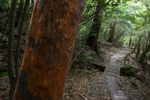 登山口から山に入り、まずは韓国岳の直下に広がる大浪池を目指す。はじめのうちは歩きやすい石畳の階段が続き、段差もゆるやかでゆっくりペースをあげていけるのがありがたい。森を通るルートには大きな赤松の木も多く、沿道のすぐそばで巨木を見ることができる。やがて道は石が転がる道へと変わり、小さな沢に架かる橋などを越えていく。