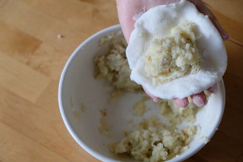 生地を4等分してから広げ、それぞれにじゃがいもあんを包みます。生地が手につくときは、手粉として米粉を少し使うと作業がしやすくなります。