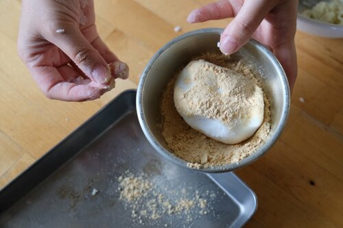 きな粉とすり黒ごまを混ぜたものを全体にまぶすと、本物のじゃがいものような見た目に早変わりしますよ。くぼみの部分にもしっかり粉をまぶしましょう。
